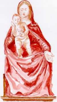 In the apse stood a coloured wooden statue superbly made in the 16th century, representing a throned Virgin Mary with Baby standing on her lap and imparting Benedictions. Due to a robbery in 1971 the only remaining evidences of the statue are photographs.