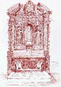 To the sides of the doorway two wide strips divided into four panels were showing a Triumph of Death, a French macabre subject of which a few examples can still be found throughout our alpine valleys. The painting is today completely lost, but we know its contents thanks to a series of drawings made in 1846. On the left strip was a crowned skeleton in the act of shooting arrows at a group of ecclesiastical characters, carrying vases full of gold. On the right strip was another skeleton: disarmed and in vain pulling a bow without arrows towards the representatives of the various social classes and secular authorities, guided and preceeded by Christ, Mary and the Saints.